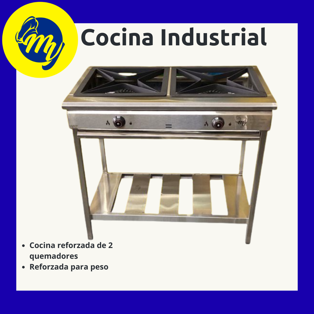 Cocina industrial a gas de 2 quemadores de hierro fundido y parrillas de ángulo negro, reforzadas para peso, fabricadas en acero.